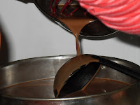 Para evitar que se mezclen los chocolates al ponerlo en el molde..dejaremos que cuaje pero que no enfrié del todo sino los chocolates no pegaran...la segunda capa tendremos que ponerlo echando la crema sobre un cucharón como en la foto haciendo de cascada para que no mezclen...y el tercero igual....